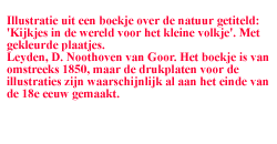 Als men op een stuk land koeijen en ander vee ziet grazen , dan noemt men zulk eene grasvlakte weiland; doch als het gras er welig opgroeit, zonder dat het door vee wordt opgegeten, dan begrijpt men dat aan zulk eene grasvlakte de naam moet worden gegeven van Gooiland. En wanneer het gras op zulk een stuk hooiland lang genoeg geworden is, wordt het met eene zeis afgemaaid,door menschen die daarom den naam dragen van grasmaaijers. Wanneer nu het afgemaaide gras eene poos zoo gelegen heeft, wordt het met eene hooivork omgekeerd, zooals dat te zien is op de onderste afbeelding aan uwe regterhand. Dit omkeeren geschiedt, om het gras aar weerszijden aan de zon bloot te stellen, ten einde het door en door cboog te laten worden. Is het gras goed droog, dan heet het hooi; en dan wordt het gerijfd en op hoopen gezet, zooals gij dat zien kunt op de onderste afbeelding aan uwe linkerhand. En dit geschied zijnde, wordt het op een boerenwagen — die alsdan hooiwagen heet— geladen. Met behulpvan groote hooivorken, welke slechts twee tanden hebben, wordt het hooi op den wagen geladen, en dan, om het er niet af te laten vallen, met een langen houten boom vastgesjord. Dit is een dikke paal, die overlangs boven op de wagenvracht hooi wordt gelegd , en dan aan de beide einden met een stevig touw naar omlaag wordt getrokken, en vastgemaakt, zoodat het hooi op de wagen zoo vast zit als een muur. Met dien vollen wagen rijdt men naar huis, bergt het hooi in de schuur of in de hooi- schelf, en keert dan terug naar het land om op nieuw den wagen vol te laden. Al deze werkzaamheden noemt men "het hooi binnen halen" of den "hooibouw". De hooibouw is een vrolijk feest. De "knechtjes en meisjes", zooaïs de boeren zeggen, eten dan des middags op het land in de opene lucht, en komen des avonds vrolijk en zingend naar huis rijden. Het gedroogde gras, anders gezegd het hooi, kan den ganschen winter goedgehouden worden en dient tot stalvoeder voor paarden en koeijen en ander vee. Als de hooi- bouw zeer vroeg kan plaats hebben, bij voorbeeld in een vruchtbaar jaar, dan groeit het afgemaaide gras weder aan, en kan het nog eens — ja somwijlen nog wel twee maal — gemaaid worden. Het eerst gewonnen hooi, dat is het hooi 'van het eerste maalsel, heet dan »hooi van de eerste snede; 'het tweede hooi van de tweede snede, en het derde hooi van de derde snede. Het tweede en derde hooi wordt ook wel "nagras^ of "nagroen" genoemd. Op de middelste afbeelding van ons plaatje ziet gij een paar insekten , welke algemeen bekend zijn onder den naam van sprinkhanen. Deze diertjes zijn van vleugels voorzien en hebben lange springbeenen. Ook zijn er eene menigte soor- ten van sprinkhanen in allerhande grootte. In de oostersche landen nemen de sprinkhanen niet zelden derwijze de over- hand , dat ze in groote zwermen als zware, onweerswolken komen aanvliegen, en vele mijlen in het rond alle bladeren en knoppen van hoornen en planten opeten, waardoor niet gelden hongersnood ontstaat. De sprinkhanen waren dan ook een der plagen van Egypte , zooals wij uit de geschiedenis van Mozes leeren. — Er zijn in Azië en Afrika ook sprink- hanen , die men kan braden, om ze dan te eten. Johannes de Dooper at sprinkhanen en wilden honig. Gij zoudt geen sprinkhanen lusten , zult gij misschien zeggen; maar wij eten immers wel kreeften , die toch ook tot de insekten behooren.